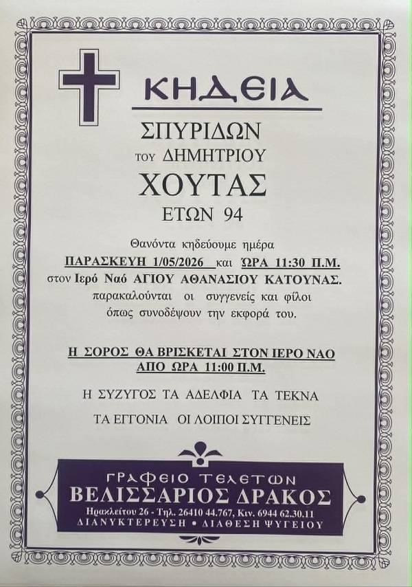 ΚΗΔΕΙΑ – ΠΑΡΑΣΚΕΥΗ 1/5/2026 – ΣΠΥΡΙΔΩΝ Δ. ΧΟΥΤΑΣ ΕΤΩΝ 94