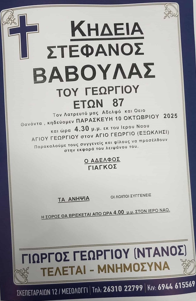 ΚΗΔΕΙΑ – ΠΑΡΑΣΚΕΥΗ 10/10/2025 – ΣΤΕΦΑΝΟΣ Γ. ΒΑΒΟΥΛΑΣ ΕΤΩΝ 87
