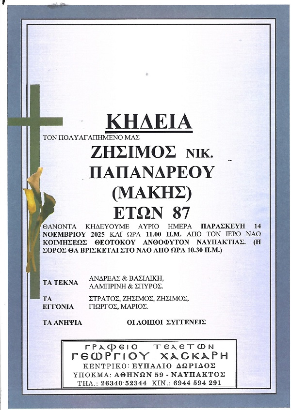ΚΗΔΕΙΑ – ΠΑΡΑΣΚΕΥΗ 14/11/2025 – ΖΗΣΙΜΟΣ Ν. ΠΑΠΑΝΔΡΕΟΥ ΕΤΩΝ 87