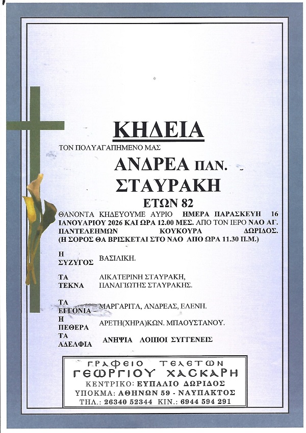 ΑρχικήΚΗΔΕΙΕΣΦωκίδαςΚΗΔΕΙΑ - ΠΑΡΑΣΚΕΥΗ 16/1/2026 - ΑΝΔΡΕΑΣ Π. ΣΤΑΥΡΑΚΗΣ ΕΤΩΝ 82