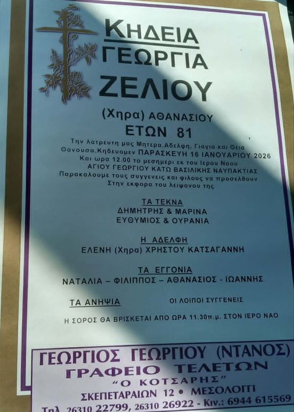 ΑρχικήΚΗΔΕΙΕΣAιτωλοακαρνανίαςΚΗΔΕΙΑ - ΠΑΡΑΣΚΕΥΗ 16/1/2026 - ΓΕΩΡΓΙΑ Α. ΖΕΛΙΟΥ ΕΤΩΝ 81