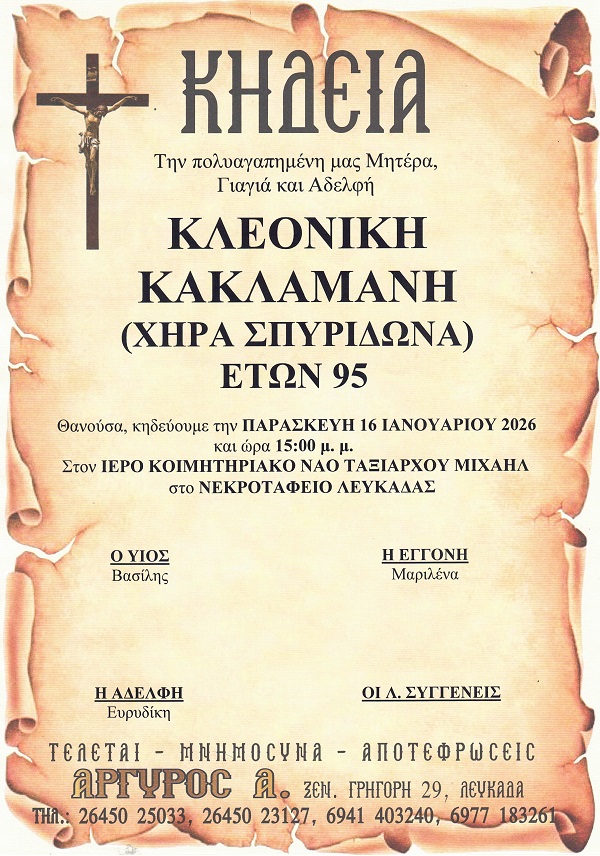 ΑρχικήΚΗΔΕΙΕΣΛευκάδαςΚΗΔΕΙΑ - ΠΑΡΑΣΚΕΥΗ 16/1/2026 - ΚΛΕΟΝΙΚΗ Σ. ΚΑΚΛΑΜΑΝΗ ΕΤΩΝ 95