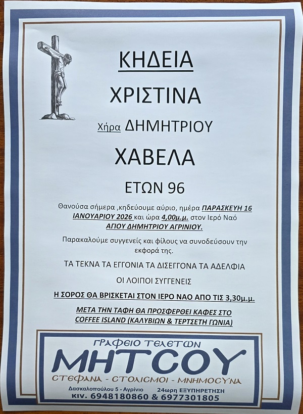ΚΗΔΕΙΑ – ΠΑΡΑΣΚΕΥΗ 16/1/2026 – ΧΡΙΣΤΙΝΑ Δ. ΧΑΒΕΛΑ ΕΤΩΝ 96