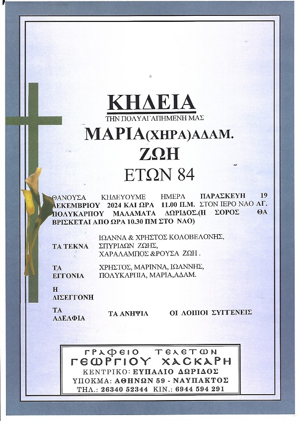 ΑρχικήΚΗΔΕΙΕΣΦωκίδαςΚΗΔΕΙΑ - ΠΑΡΑΣΚΕΥΗ 19/12/2025 - ΜΑΡΙΑ Α. ΖΩΗ ΕΤΩΝ 84