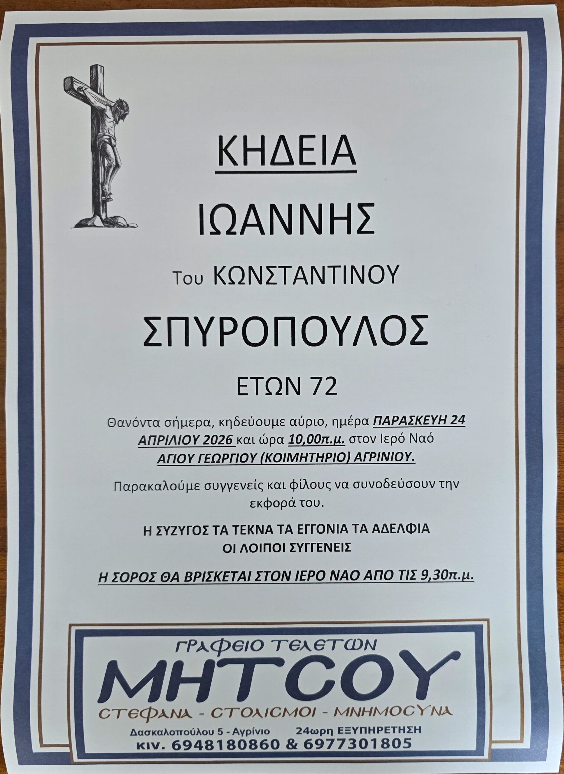 ΑρχικήΚΗΔΕΙΕΣAιτωλοακαρνανίαςΚΗΔΕΙΑ - ΠΑΡΑΣΚΕΥΗ 2/4/2026 - ΙΩΑΝΝΗΣ Κ. ΣΠΥΡΟΠΟΥΛΟΣ ΤΩΝ 72