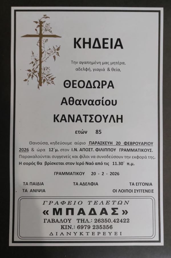 ΚΗΔΕΙΑ – ΠΑΡΑΣΚΕΥΗ 20/2/2026 – ΘΕΟΔΩΡΑ Α. ΚΑΝΑΤΣΟΥΛΗ ΕΤΩΝ 85