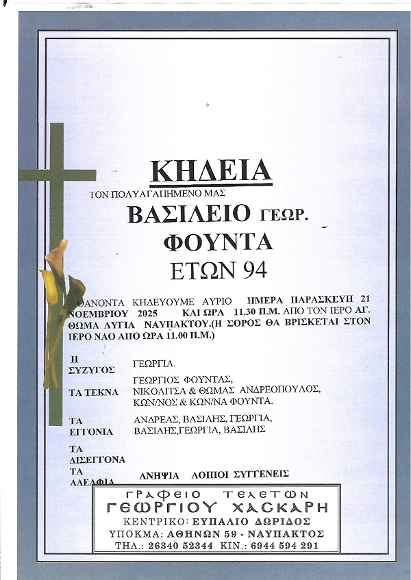 ΚΗΔΕΙΑ – ΠΑΡΑΣΚΕΥΗ 21/11/2025 – ΒΑΣΙΛΕΙΟΣ Γ. ΦΟΥΝΤΑΣ ΕΤΩΝ 94