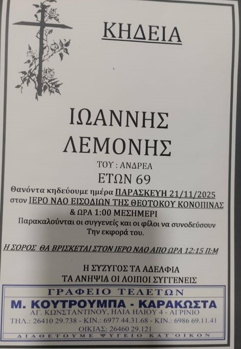 ΚΗΔΕΙΑ – ΠΑΡΑΣΚΕΥΗ 21/11/2025 – ΙΩΑΝΝΗΣ Α. ΛΕΜΟΝΗΣ ΕΤΩΝ 69