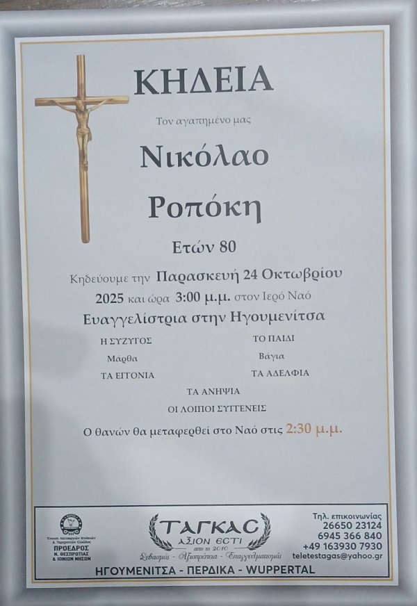 ΚΗΔΕΙΑ – ΠΑΡΑΣΚΕΥΗ 24/10/2025 – ΝΙΚΟΛΑΟΣ ΡΟΠΟΚΗΣ ΕΤΩΝ 80