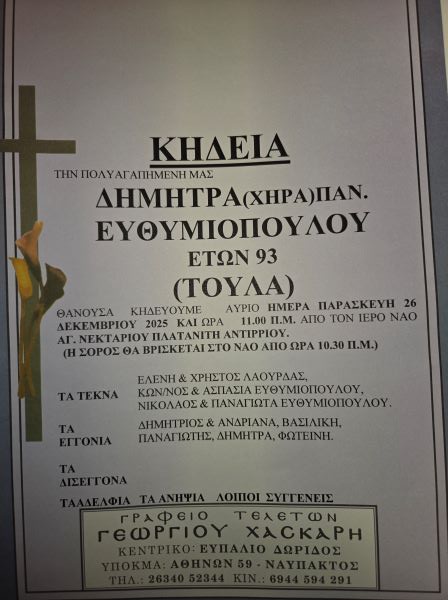 ΑρχικήΚΗΔΕΙΕΣAιτωλοακαρνανίαςΚΗΔΕΙΑ - ΠΑΡΑΣΚΕΥΗ 26/12/2025 - ΔΗΝΗΤΡΑ Π. ΕΥΘΥΜΙΟΠΟΥΛΟΥ ΕΤΩΝ 93
