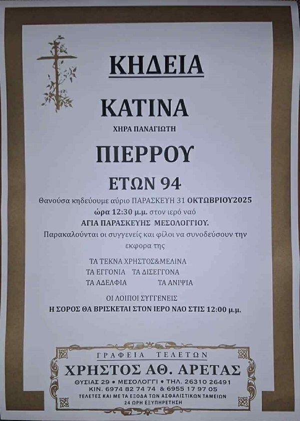 ΚΗΔΕΙΑ – ΠΑΡΑΣΚΕΥΗ 31/10/2025 – ΚΑΤΙΝΑ Π. ΠΙΕΡΡΟΥ ΕΤΩΝ 94