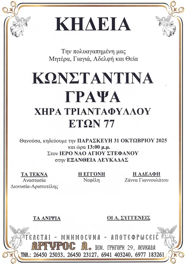 ΑρχικήΚΗΔΕΙΕΣΛευκάδαςΚΗΔΕΙΑ - ΠΑΡΑΣΚΕΥΗ 31/10/2025 - ΚΩΝΣΤΑΝΤΙΝΑ Τ. ΓΡΑΨΑ ΕΤΩΝ 77