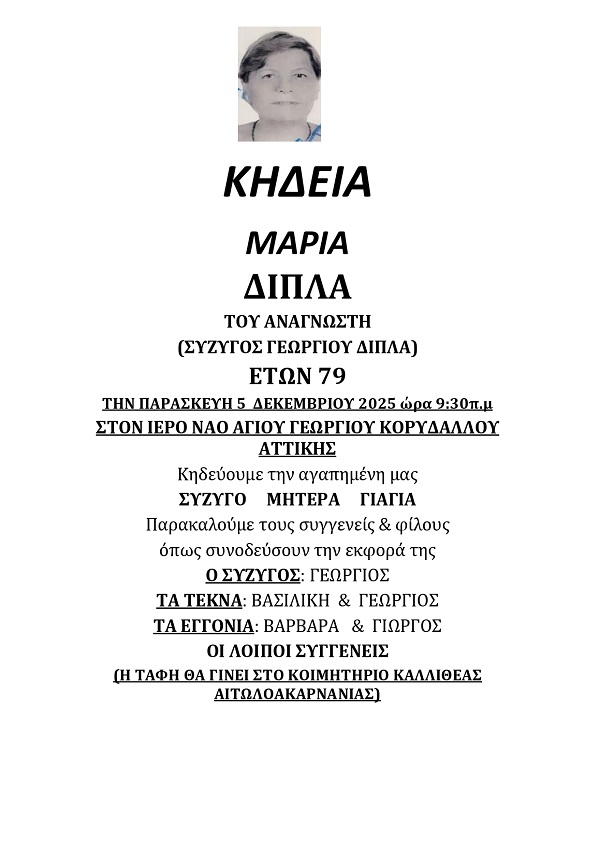 ΚΗΔΕΙΑ – ΠΑΡΑΣΚΕΥΗ 5/12/2025 – ΜΑΡΙΑ Α. ΔΙΠΛΑ ΕΤΩΝ 79