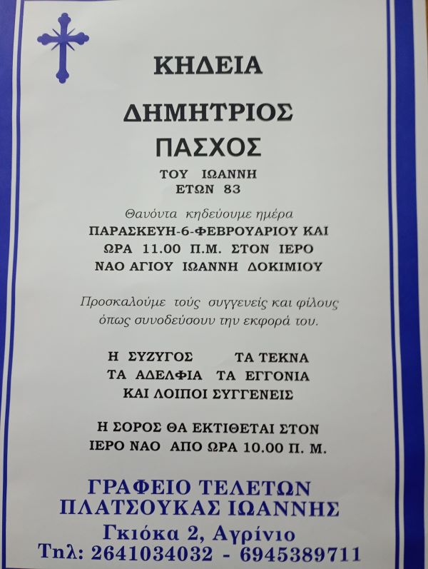 ΑρχικήΚΗΔΕΙΕΣAιτωλοακαρνανίαςΚΗΔΕΙΑ - ΠΑΡΑΣΚΕΥΗ 6/2/2026 - ΔΗΜΗΤΡΙΟΣ Ι. ΠΑΣΧΟΣ ΕΤΩΝ 83