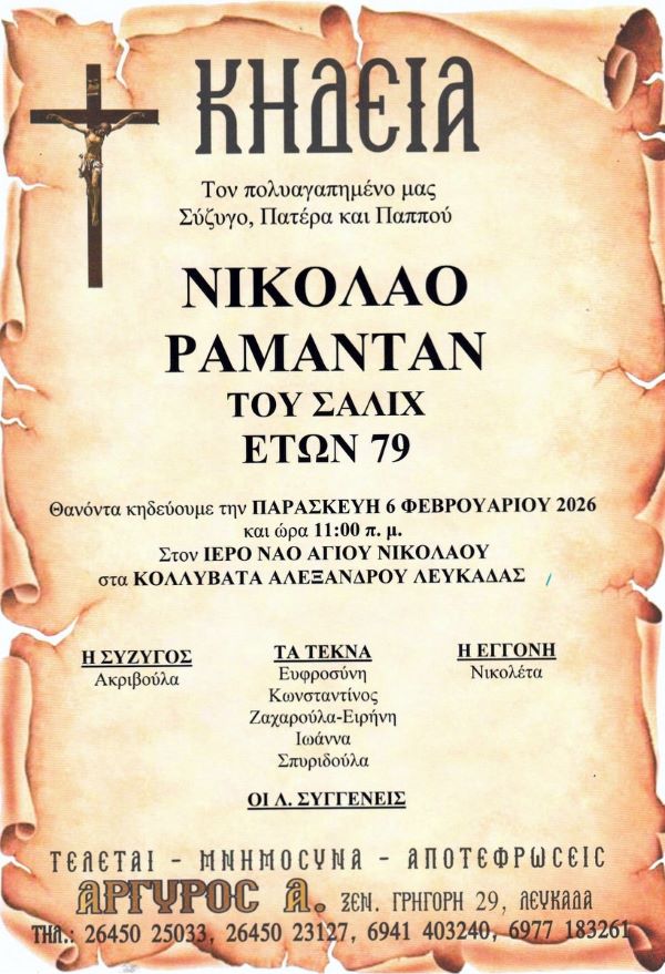 ΑρχικήΚΗΔΕΙΕΣΛευκάδαςΚΗΔΕΙΑ - ΠΑΡΑΣΚΕΥΗ 6/2/2026 - ΝΙΚΟΛΑΟΣ Σ. ΡΑΜΑΝΤΑΝ ΕΤΩΝ 79