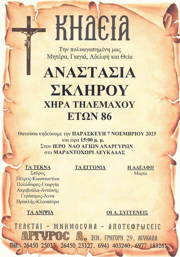 ΚΗΔΕΙΑ – ΠΑΡΑΣΚΕΥΗ 7/11/2025 – ΑΝΑΣΤΑΣΙΑ Τ. ΣΚΛΗΡΟΥ ΕΤΩΝ 86