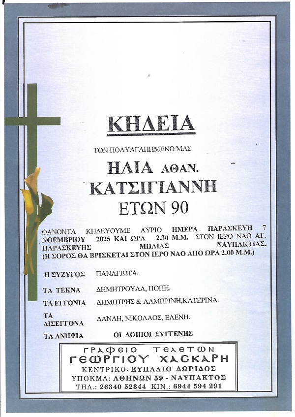 ΚΗΔΕΙΑ – ΠΑΡΑΣΚΕΥΗ 7/11/2025 – ΗΛΙΑΣ Α. ΚΑΤΣΙΓΙΑΝΝΗΣ ΕΤΩΝ 90
