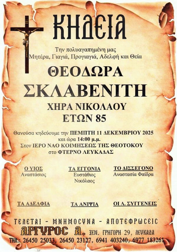 ΑρχικήΚΗΔΕΙΕΣΛευκάδαςΚΗΔΕΙΑ - ΠΕΜΠΤΗ 11/12/2025 - ΘΕΟΔΩΡΑ Ν. ΣΚΛΑΒΕΝΙΤΗ ΕΤΩΝ 85