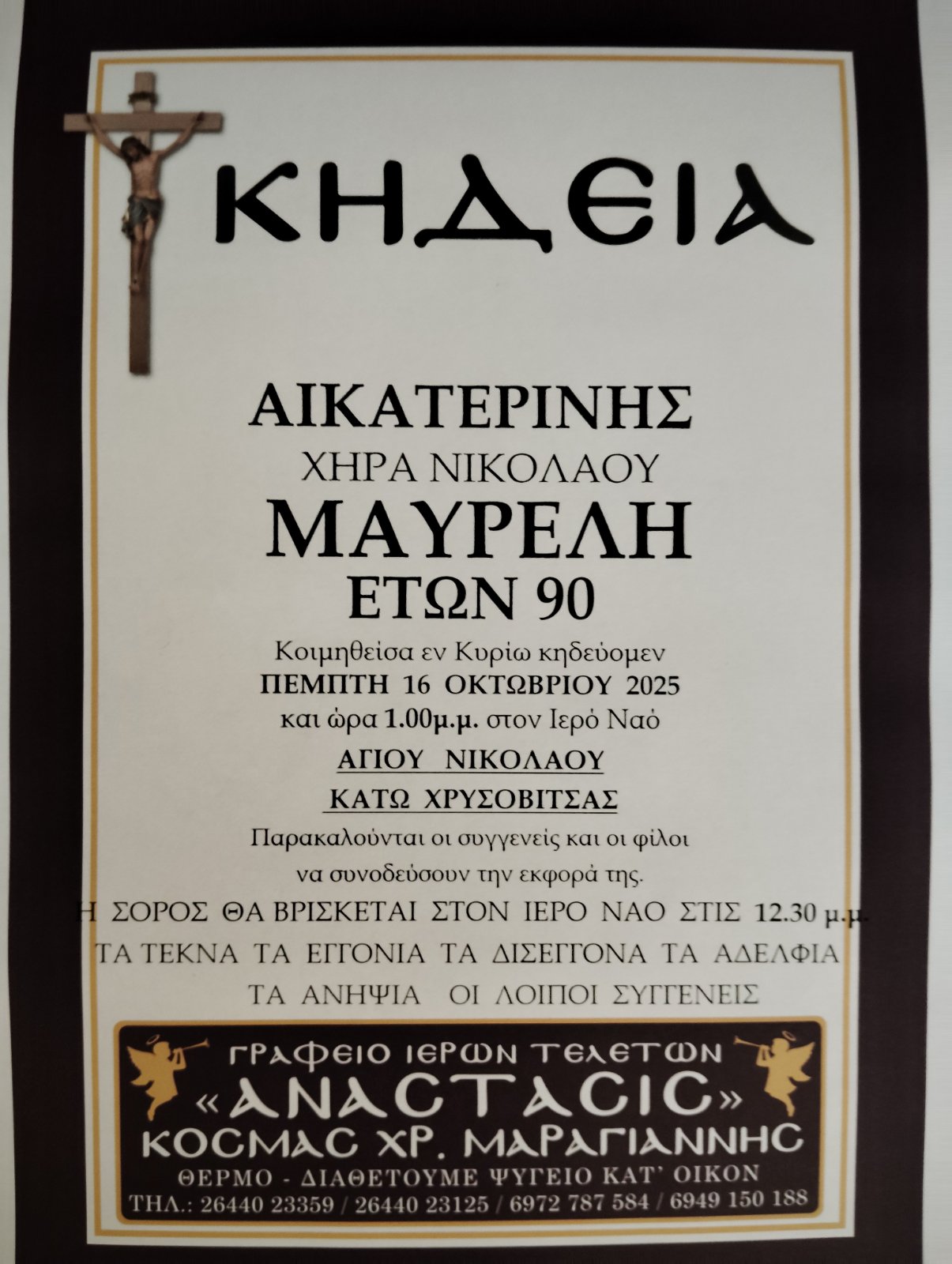 ΚΗΔΕΙΑ – ΠΕΜΠΤΗ 16/10/2025 – ΑΙΚΑΤΕΡΙΝΗ Ν. ΜΑΥΡΕΛΗ ΕΤΩΝ 90