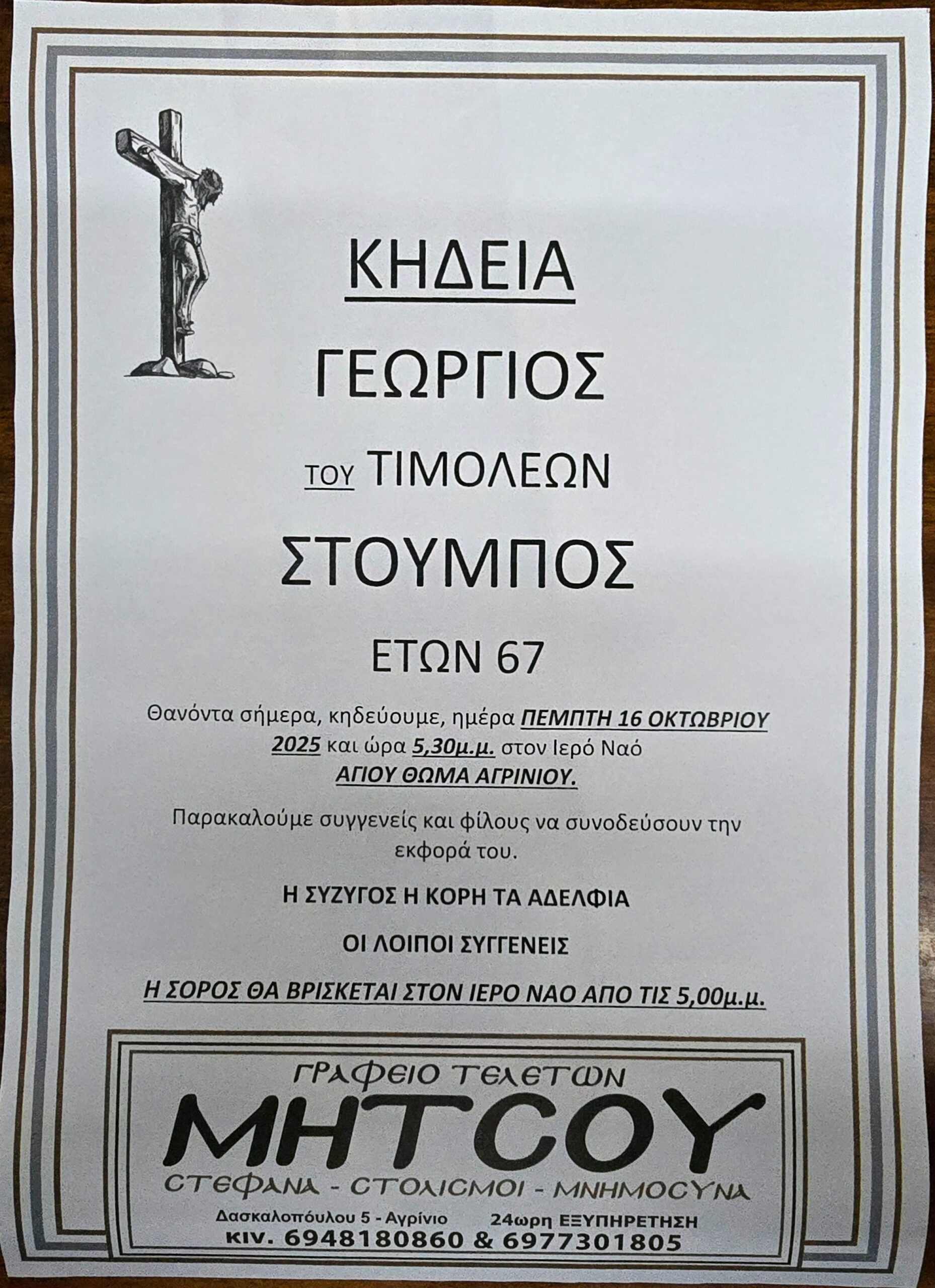 ΑρχικήΚΗΔΕΙΕΣAιτωλοακαρνανίαςΚΗΔΕΙΑ - ΠΕΜΠΤΗ 16/10/2025 - ΓΕΩΡΓΙΟΣ Τ. ΣΤΟΥΜΠΟΣ ΕΤΩΝ 67