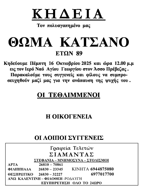ΑρχικήΚΗΔΕΙΕΣΠρέβεζαςΚΗΔΕΙΑ - ΠΕΜΠΤΗ 16/10/2025 - ΘΩΜΑΣ ΚΑΤΣΑΝΟΣ ΕΤΩΝ 89