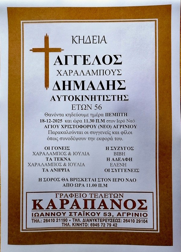 ΚΗΔΕΙΑ – ΠΕΜΠΤΗ 18/12/2025 – ΑΓΓΕΛΟΣ Χ. ΔΗΜΑΔΗΣ ΕΤΩΝ 56