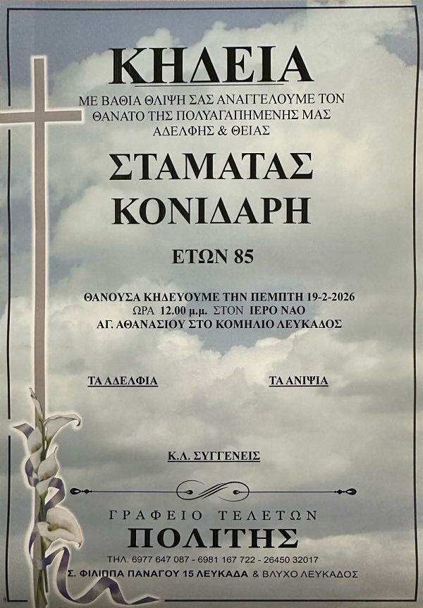 ΑρχικήΚΗΔΕΙΕΣΛευκάδαςΚΗΔΕΙΑ - ΠΕΜΠΤΗ 19/2/2026 - ΣΤΑΜΑΤΑ ΚΟΝΙΔΑΡΗ ΕΤΩΝ 85