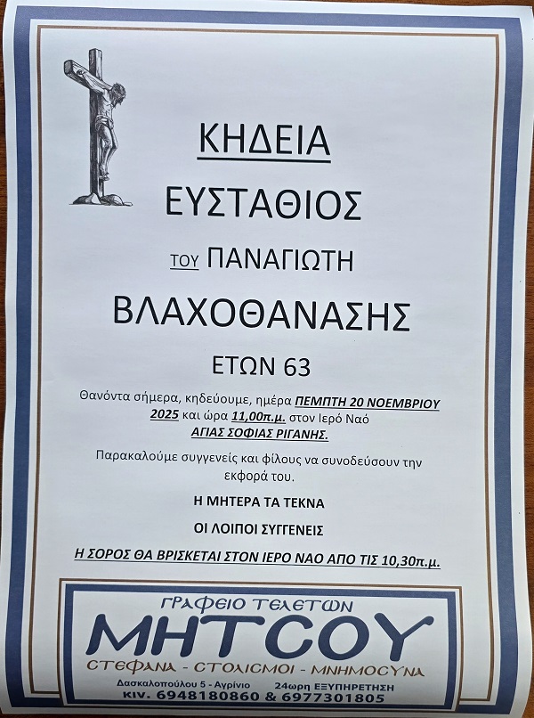 ΑρχικήΚΗΔΕΙΕΣAιτωλοακαρνανίαςΚΗΔΕΙΑ - ΠΕΜΠΤΗ 20/11/2025 - ΕΥΣΤΑΘΙΟΣ Π. ΒΛΑΧΟΘΑΝΑΣΗΣ ΕΤΩΝ 63