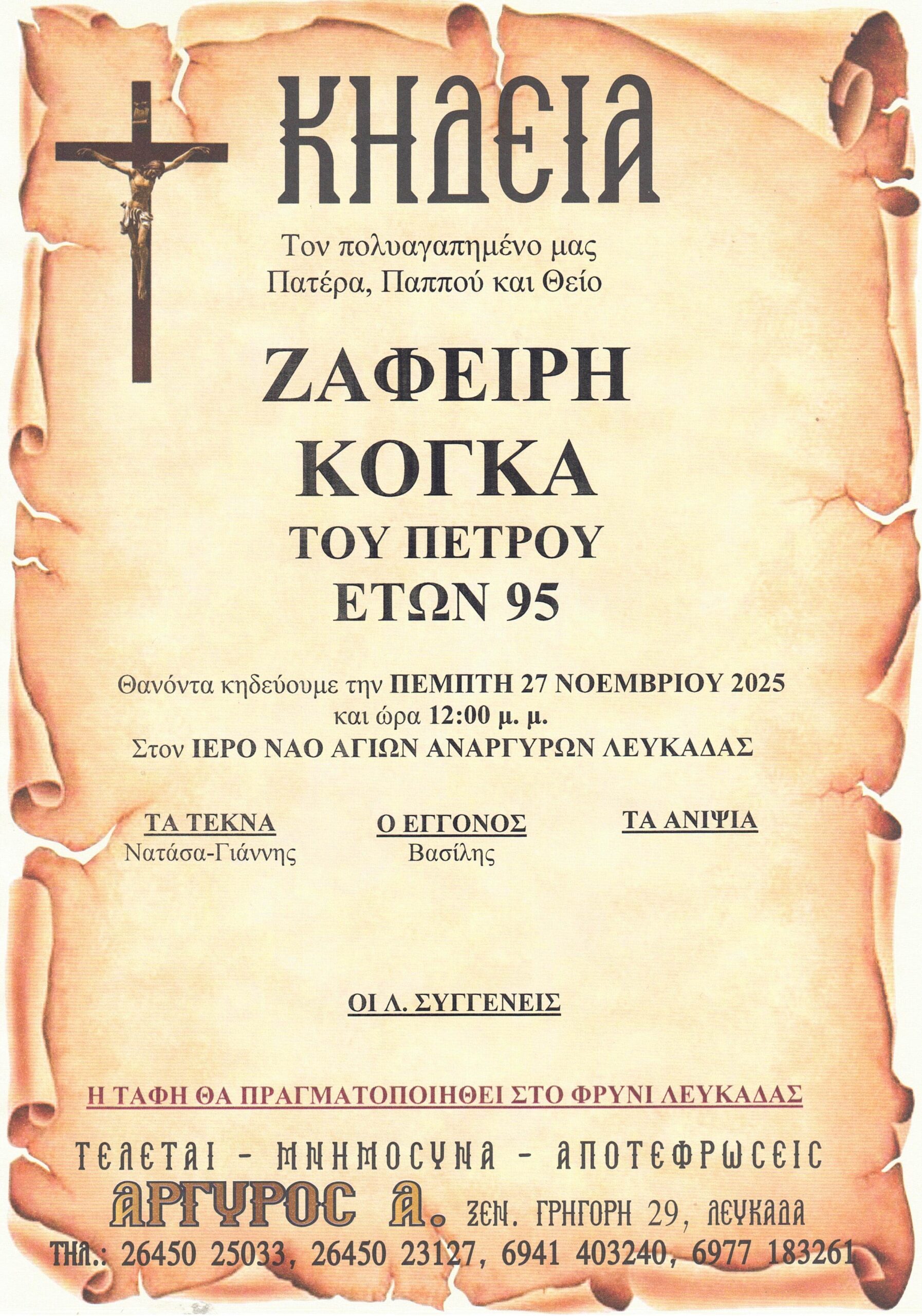 ΑρχικήΚΗΔΕΙΕΣΛευκάδαςΚΗΔΕΙΑ - ΠΕΜΠΤΗ 27/11/2025 - ΖΑΦΕΙΡΗ Π. ΚΟΓΚΑ ΕΤΩΝ 95