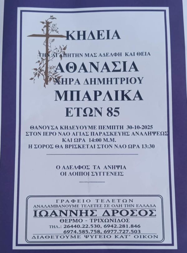 ΑρχικήΚΗΔΕΙΕΣAιτωλοακαρνανίαςΚΗΔΕΙΑ - ΠΕΜΠΤΗ 30/10/2025 - ΑΘΑΝΑΣΙΑ Δ. ΜΠΑΡΛΙΚΑ ΕΤΩΝ 85