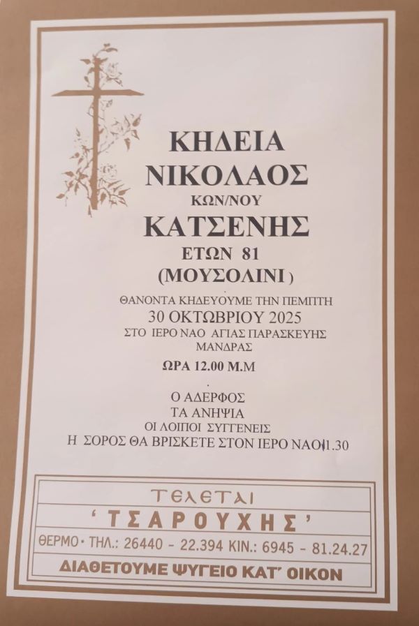 ΚΗΔΕΙΑ – ΠΕΜΠΤΗ 30/10/2025 – ΝΙΚΟΛΑΟΣ Κ. ΚΑΤΣΕΝΗΣ ΕΤΩΝ 81