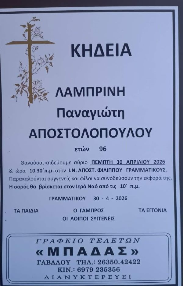 ΑρχικήΚΗΔΕΙΕΣAιτωλοακαρνανίαςΚΗΔΕΙΑ - ΠΕΜΠΤΗ 30/4/2026 - ΛΑΜΠΡΙΝΗ Π. ΑΠΟΣΤΟΛΟΠΟΥΛΟΥ ΕΤΩΝ 96