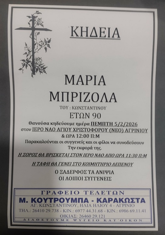 ΑρχικήΚΗΔΕΙΕΣAιτωλοακαρνανίαςΚΗΔΕΙΑ - ΠΕΜΠΤΗ 5/2/2026 - ΜΑΡΙΑ Κ. ΜΠΡΙΖΟΛΑ ΕΤΩΝ 90