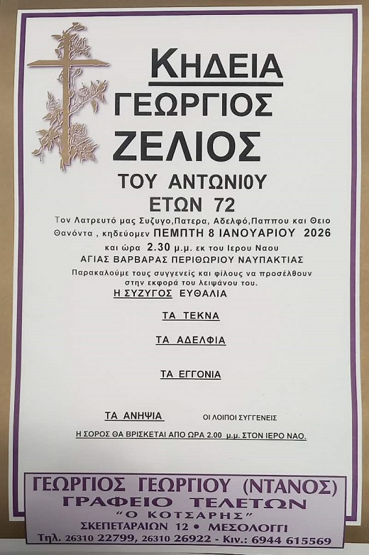 ΚΗΔΕΙΑ – ΠΕΜΠΤΗ 8/1/2026 – ΓΕΩΡΓΙΟΣ Α. ΖΕΛΙΟΣ ΕΤΩΝ 72