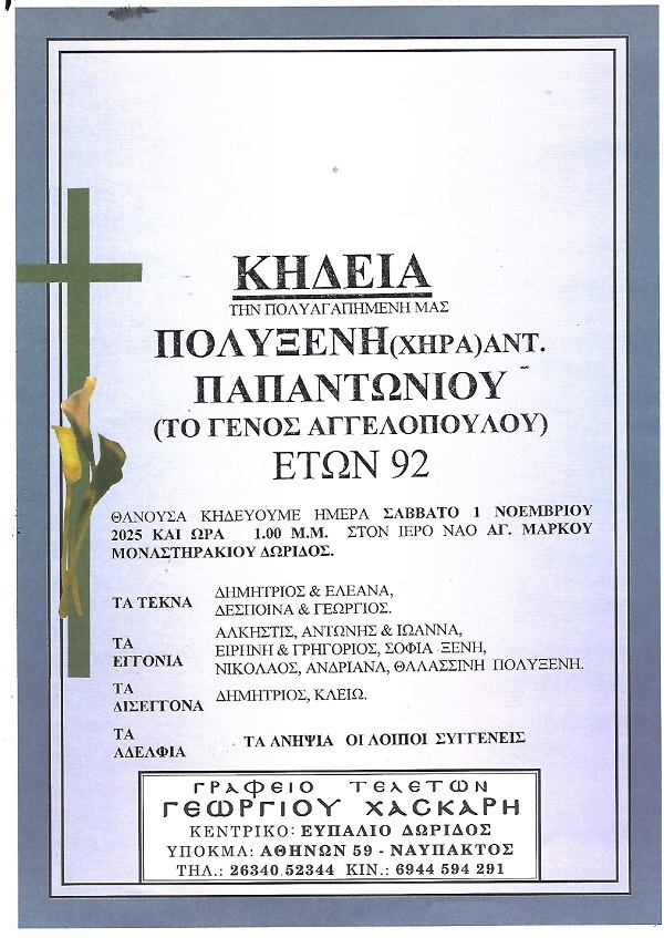 ΑρχικήΚΗΔΕΙΕΣΦωκίδαςΚΗΔΕΙΑ - ΣΑΒΒΑΤΟ 1/11/2025 - ΠΟΛΥΞΕΝΗ Α. ΠΑΠΑΝΤΩΝΙΟΥ ΕΤΩΝ 92