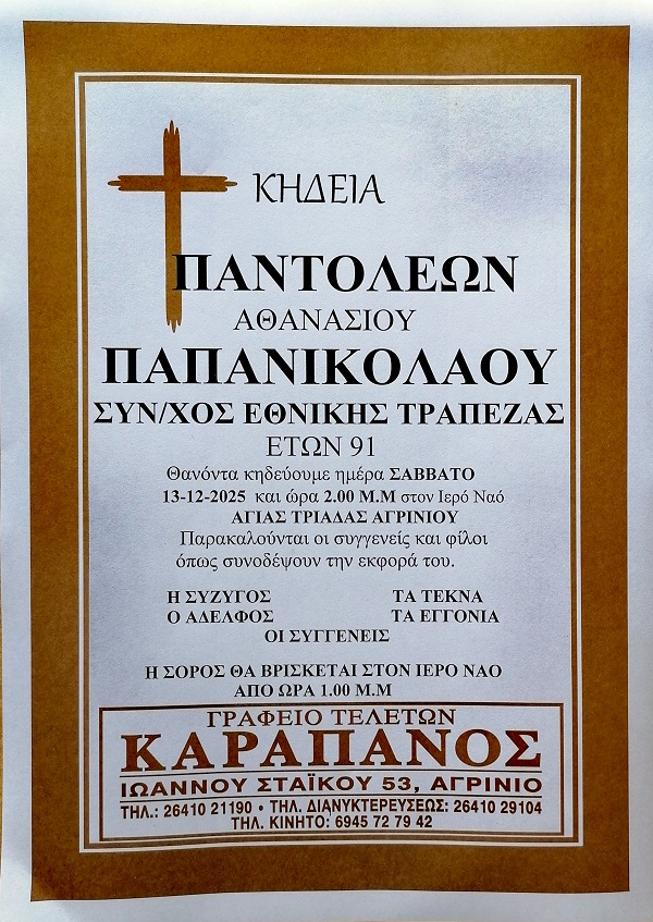 ΑρχικήΚΗΔΕΙΕΣAιτωλοακαρνανίαςΚΗΔΕΙΑ - ΣΑΒΒΑΤΟ 13/12/2025 - ΠΑΝΤΟΛΕΩΝ Α. ΠΑΠΑΝΙΚΟΛΑΟΥ ΕΤΩΝ 91