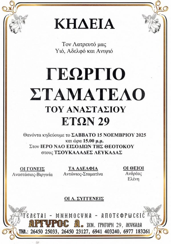 ΑρχικήΚΗΔΕΙΕΣΛευκάδαςΚΗΔΕΙΑ - ΣΑΒΒΑΤΟ 15/12/2025 - ΓΕΩΡΓΙΟΣ Α. ΣΤΑΜΑΤΕΛΟΣ ΕΤΩΝ 29