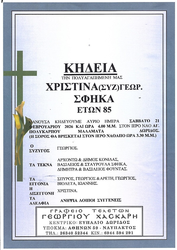 ΑρχικήΚΗΔΕΙΕΣΦωκίδαςΚΗΔΕΙΑ - ΣΑΒΒΑΤΟ 21/2/2026 - ΧΡΙΣΤΙΝΑ Γ. ΣΦΗΚΑ ΕΤΩΝ 85