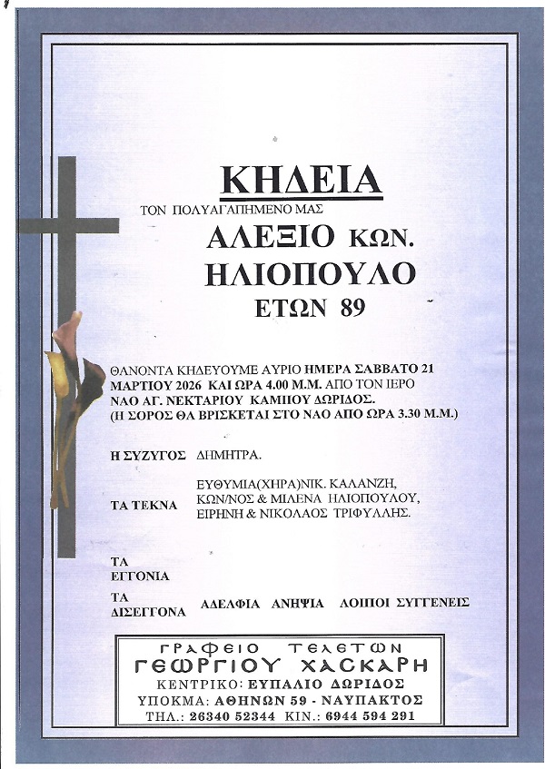 ΑρχικήΚΗΔΕΙΕΣΦωκίδαςΚΗΔΕΙΑ - ΣΑΒΒΑΤΟ 21/3/2026 - ΑΛΕΞΙΟΣ Κ. ΗΛΙΟΠΟΥΛΟΣ ΕΤΩΝ 89