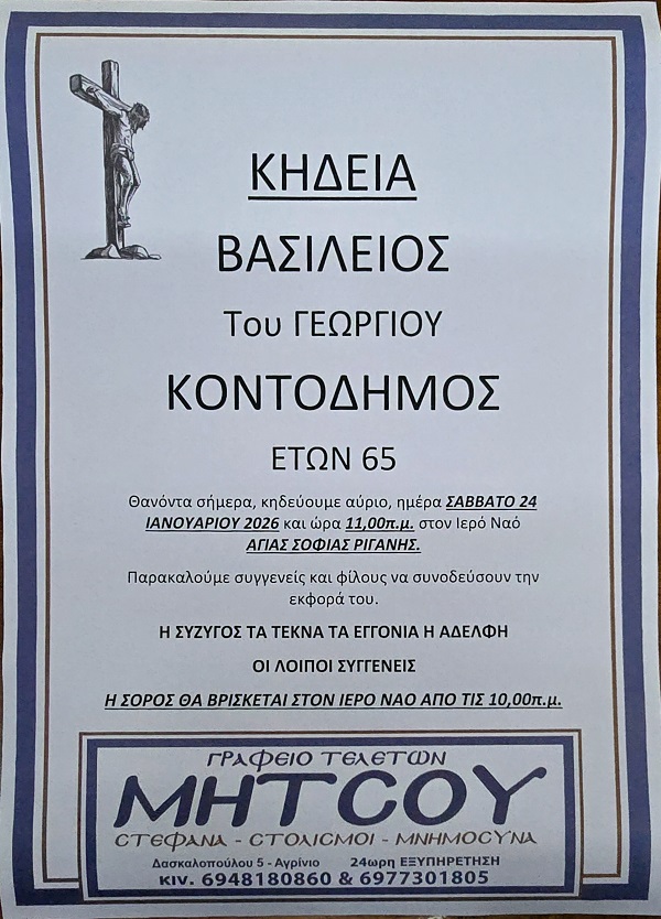 ΑρχικήΚΗΔΕΙΕΣAιτωλοακαρνανίαςΚΗΔΕΙΑ - ΣΑΒΒΑΤΟ 24/1/2026 - ΒΑΣΙΛΕΙΟΣ Γ. ΚΟΝΤΟΔΗΜΟΣ ΕΤΩΝ 65