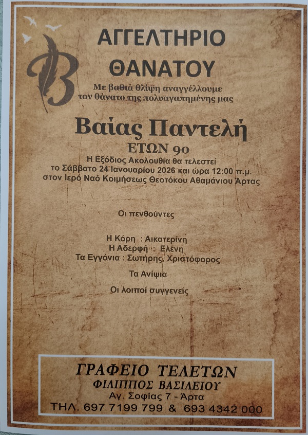 ΑρχικήΚΗΔΕΙΕΣΆρταςΚΗΔΕΙΑ - ΣΑΒΒΑΤΟ 24/1/2026 - ΒΑΪΑ ΠΑΝΤΕΛΗ ΕΤΩΝ 90