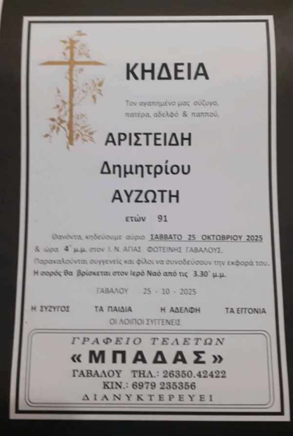 ΚΗΔΕΙΑ – ΣΑΒΒΑΤΟ 25/10/2025 – ΑΡΙΣΤΕΙΔΗΣ Δ. ΑΥΖΩΤΗΣ ΕΤΩΝ 91
