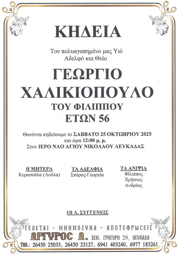 ΑρχικήΚΗΔΕΙΕΣΛευκάδαςΚΗΔΕΙΑ - ΣΑΒΒΑΤΟ 25/10/2025 - ΓΕΩΡΓΙΟΣ Φ. ΧΑΛΙΚΙΟΠΟΥΛΟΣ ΕΤΩΝ 56