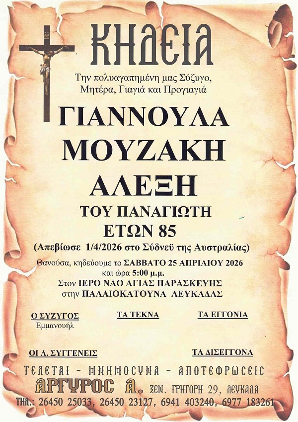 ΑρχικήΚΗΔΕΙΕΣΛευκάδαςΚΗΔΕΙΑ - ΣΑΒΒΑΤΟ 25/4/2026 - ΓΙΑΝΝΟΥΛΑ Π. ΜΟΥΖΑΚΗ-ΑΛΕΞΗ ΕΤΩΝ 85