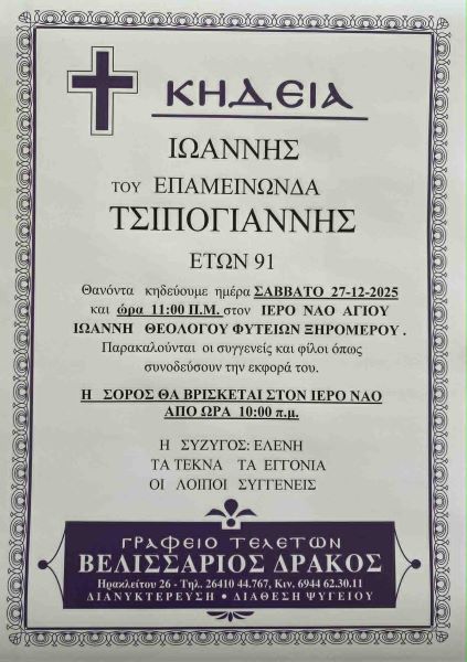 ΚΗΔΕΙΑ – ΣΑΒΒΑΤΟ 27/12/2025 – ΙΩΑΝΝΗΣ Ε. ΤΣΙΠΟΓΙΑΝΝΗΣ ΕΤΩΝ 91