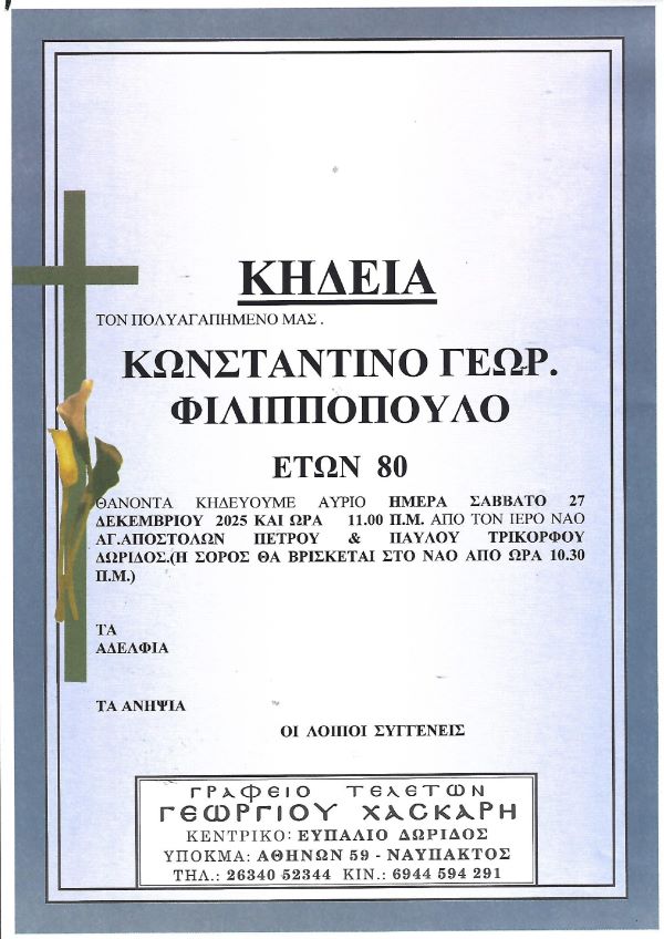 ΚΗΔΕΙΑ – ΣΑΒΒΑΤΟ 27/12/2025 – ΚΩΝΣΤΑΝΤΙΝΟΣ Γ. ΦΙΛΙΠΠΟΠΟΥΛΟΣ