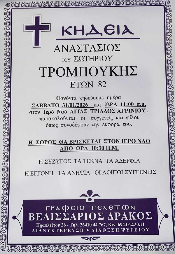 ΑρχικήΚΗΔΕΙΕΣAιτωλοακαρνανίαςΚΗΔΕΙΑ - ΣΑΒΒΑΤΟ 31/1/2026 - ΑΝΑΣΤΑΣΙΟΣ Σ. ΤΡΟΜΠΟΥΚΗΣ ΕΤΩΝ 82