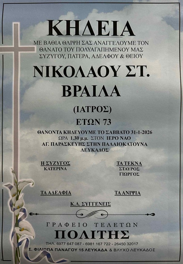 ΑρχικήΚΗΔΕΙΕΣΛευκάδαςΚΗΔΕΙΑ - ΣΑΒΒΑΤΟ 31/1/2026 - ΝΙΚΟΛΑΟΣ ΣΤ. ΒΡΑΙΛΑΣ ΕΤΩΝ 73