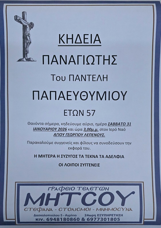 ΑρχικήΚΗΔΕΙΕΣAιτωλοακαρνανίαςΚΗΔΕΙΑ - ΣΑΒΒΑΤΟ 31/1/2026 - ΠΑΝΑΓΙΩΤΗΣ Π. ΠΑΠΑΕΥΘΥΜΙΟΥ ΕΤΩΝ 57