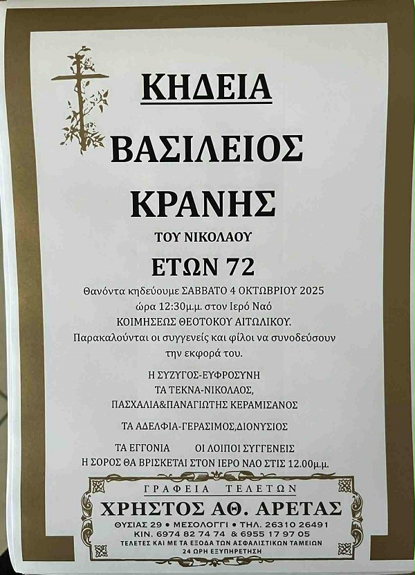 ΚΗΔΕΙΑ – ΣΑΒΒΑΤΟ 4/10/2025 – ΒΑΣΙΛΕΙΟΣ Ν. ΚΡΑΝΗΣ ΕΤΩΝ 72